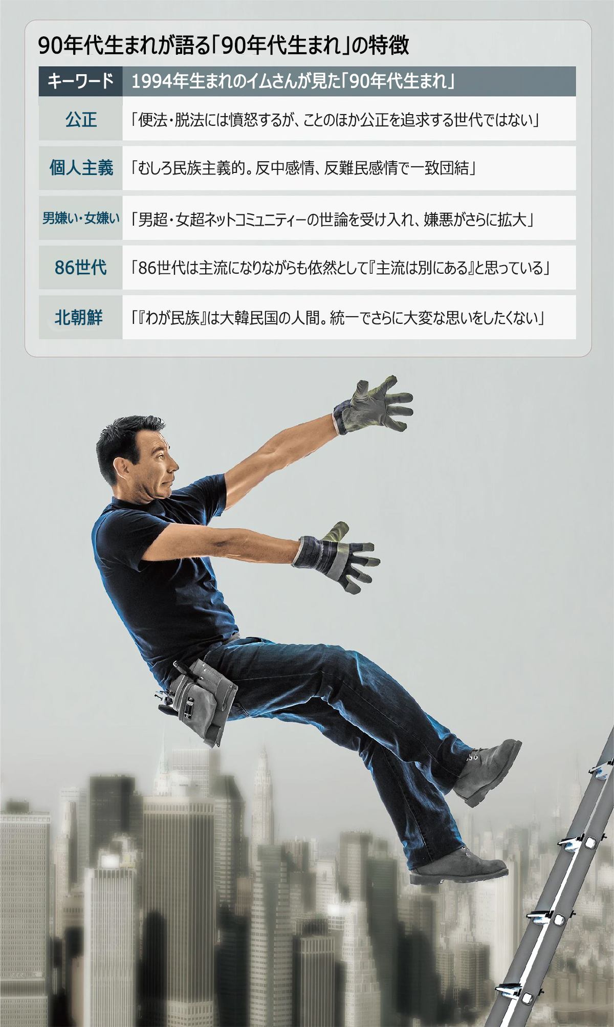 「仁川国際空港公社の非正規職転換問題、チョ・グク元法相の問題が起きた当時は怒った。だが、既成世代と比較して、ことのほか公正を追求する世代でもない。586世代(60年代に生まれて80年代に大学へ通った50代)が法律を逆用したり脱法行為をしたりして、それによって恩恵を受けた90年代生まれの子どもが、『公正』を理由に自身のチャンスを拒否することはない。90年代生まれが『能力主義』を信じていて、国家システムがこれに基づき、予測できるように動くべきだと期待しているのは事実だ」