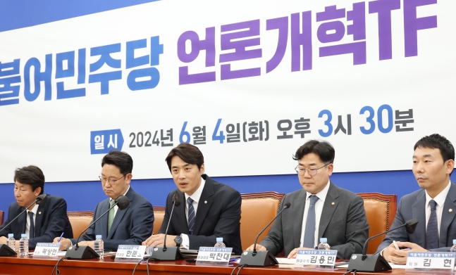▲4日に韓国国会で開かれた共に民主党言論改革TF(タスクフォース、作業部会)発隊式および第1回会議で、韓俊鎬(ハン・ジュンホ)団長が発言しているところ。民主党は第21代国会で廃棄された放送3法を再び推進することとした。/聯合ニュース