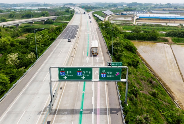 ▲平沢-堤川高速道路大所ジャンクションに設置されたピンク色と緑色の「路面色彩誘導線」。車線変更しようともたつく時間が減って渋滞解消に役立ち、交通事故も減らしてくれる。/韓国道路公社