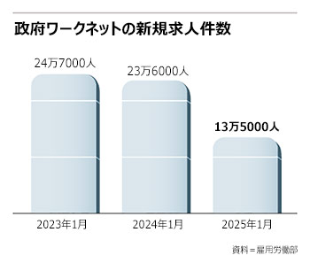 雇用労働部(省に相当)が10日に明らかにした。それによると先月ワークネットでの求職者数は47万9000人、求人数は13万5000人で、求職者1人当たりの求人数の割合を示す「有効求人倍数」は0.28にまで低下した。昨年1月と比べて求職者数は6.5%減だったが、求人数はなんと43%(10万1000件)も減少したためだ。今回の求人倍数は、0.23を記録した1999年1月以来、最も低い。