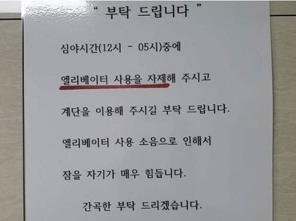 「エレベーターの音で眠れない…深夜は階段を利用して」 マンションの貼り紙に韓国ネットあ然(1/1)