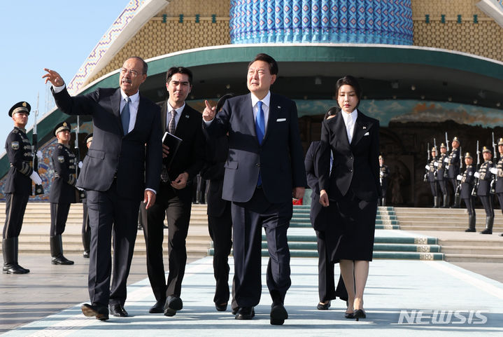 ウズベキスタン独立記念碑を訪問した尹大統領夫妻(3/13)