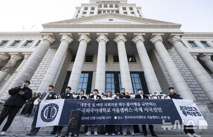 プラカードを持って「時局宣言」を行う韓国外大の学生たち(2/12)