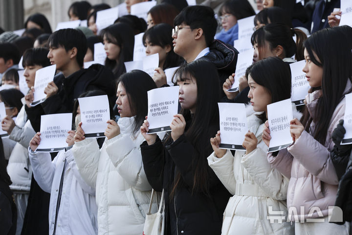 プラカードを持って「時局宣言」を行う韓国外大の学生たち(11/12)