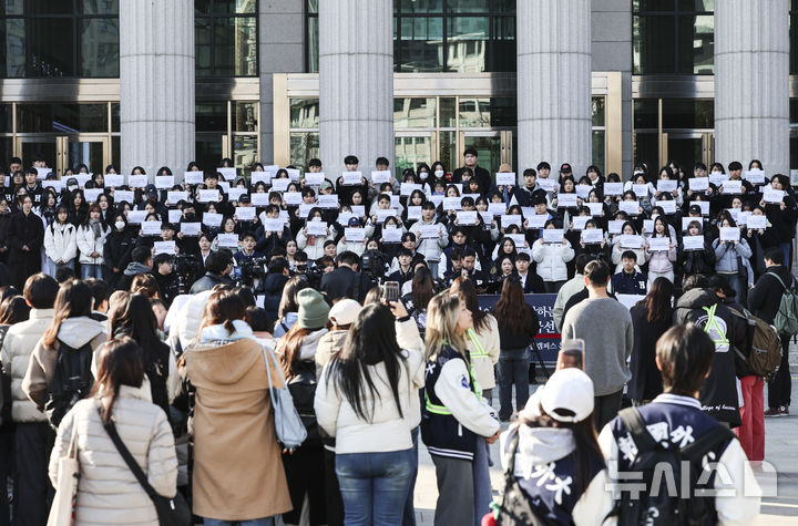 プラカードを持って「時局宣言」を行う韓国外大の学生たち(12/12)
