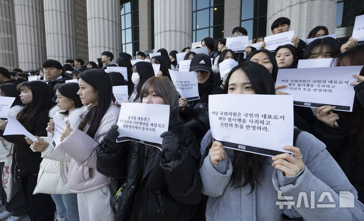 プラカードを持って「時局宣言」を行う韓国外大の学生たち(3/12)