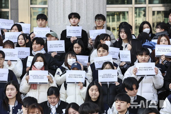 プラカードを持って「時局宣言」を行う韓国外大の学生たち(8/12)