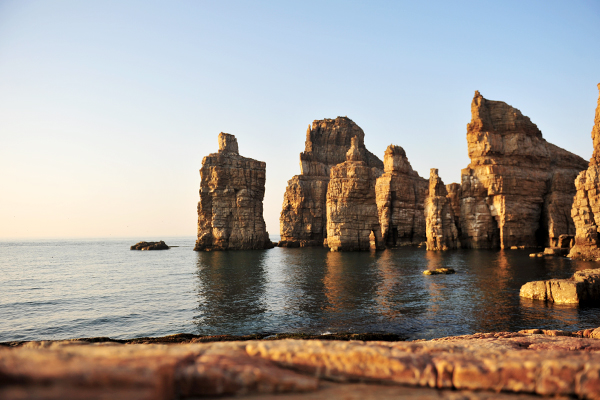 海から突き出た岩が空に向かってすっくと立ち並ぶ姿は、まるでびょうぶを広げたかのように見える。なぎの日は下に降り、間近で鑑賞することもできる。