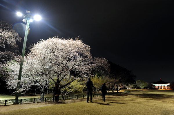 ライトアップされていたためか、千年王宮の宮殿は薄いベールに包まれたように神秘的だった。その日の夜はしとしとと雨が降っていた。それでも、かなりご年配のお年寄り、愛をささやく若いカップル、ベビーカーを押す若い夫婦など、庭園は観光客でいっぱいだった。春を満喫する人々も、春の夜の風景の一部だった。雁鴨池の夜は過去と現在、いにしえの建築物と現在の人々の心が通い合いつくり上げられたものだった。