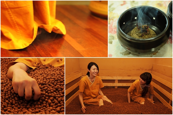 座薫体験の次に、黄土とヨモギをミックスして作った「黄土ボール全身チムジル」を体験した。小さなビー玉状の黄土ボールは、ヨモギと黄土の効能が合わさり、疲労回復の効果があるという。