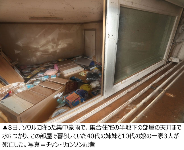 8日にソウル市内を襲った集中豪雨で、冠岳区新林洞にある低層集合住宅の半地下の部屋で暮らしていた小学校6年生の子どもとその母親、一緒に暮らしていた伯母が浸水した住宅から避難できず死亡した。伯母はダウン症候群で障害者だった。また、銅雀区上道洞でも半地下部屋で暮らしていた50代の女性が自宅で死亡しているのが発見された。ソウル市を襲った今回の集中豪雨は、月家賃や高額の伝貰(チョンセ=契約時にまとまった額の保証金を賃貸人に預け、月家賃がない不動産賃貸方式)金を払うのが難しく、半地下部屋や、作りがしっかりしていない家が多い地域で暮らす低所得層にとって、特に多大で過酷な被害をもたらした。