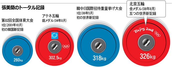 北京五輪にライバルの穆爽爽が出場しないのは確かにチャンスだったが、張美蘭は特に喜ぶような素振りも見せず、「金メダル確実という記事が多かったのでプレッシャーになった」と告白している。「漁夫の利」による金メダルではなく、誰が見ても明らかな世界一と言われるには記録を出すしかなかった。張美蘭は16日にスナッチ(140キロ)、ジャーク(186キロ)のほか、トータル(326キロ)でも世界記録で金メダルを獲得した。張美蘭は「本当にうれしいし、感謝している」と感激を隠さなかったが、すでに次の目標も定めていた。「世界選手権4連覇も達成したいし、アジア大会ではまだ優勝していない。4年後のロンドン五輪ではもっと大きな目標ができるだろう」