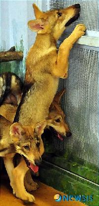 6日、大田市中区のテーマパーク「オーワールド」内にある動物園では、今年4月に生まれたチョウセンオオカミ8頭が公開された。写真は、子オオカミの世話をする飼育員。