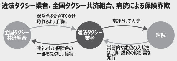 ソウル瑞草警察署は25日「タクシー運転手たちの権益を守るために設立された全国タクシー共済組合が、むしろ組合員たちの金を奪う形の保険詐欺に手を染めていた事実を突き止めた。これらの容疑で、犯行に積極的に関与したタクシー共済組合の対人被害担当者のB課長(44)と、23回にわたって保険金を受け取った違法タクシー業者のA容疑者を逮捕した」と発表した。さらに警察は捜査の過程で、全国タクシー共済組合の幹部5人と、違法タクシー業者の関係者6人だけでなく、保険詐欺だということを知りながら虚偽の診断書を発行した容疑などで、病院の関係者3人も一斉に摘発した。警察の関係者は「今回の事件は、道路上でのあらゆる迷惑行為を凝縮した、まるでギフトセットのような保険詐欺だ」と語った。