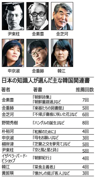 日本の知識人94人が推薦した韓国関連の図書は264種類に上った。随筆家の金素雲(キム・ソウン)が日本語に翻訳した『朝鮮詩集』『朝鮮童謡選』(7人)や、金芝河の詩・散文(6人)、尹東柱(ユン・ドンジュ)・柳岸津(ユ・アンジン)の詩(いずれも5人)、金重赫(キム・ジュンヒョク)(5人)、韓江(ハン・ガン)(4人)、黄晳暎(ファン・ソギョン)・申京淑(いずれも3人)の小説、イザベラ・バード・ビショップの『朝鮮紀行』や朴裕河(パク・ユハ)の『和解のために』(いずれも4人)などの推薦頻度が高かった。野間教授は「尹東柱、金芝河、李御寧などを除くと重複する本は特にないほど、推薦書の種類は予想よりはるかに幅広く、多様だった」と語った。