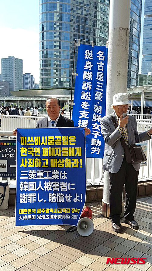 張教育監は「三菱重工業は韓国人被害者に謝罪して賠償せよ」と書かれたプラカードを持ち、三菱が挺身隊問題で責任ある姿勢を見せることを要求した。