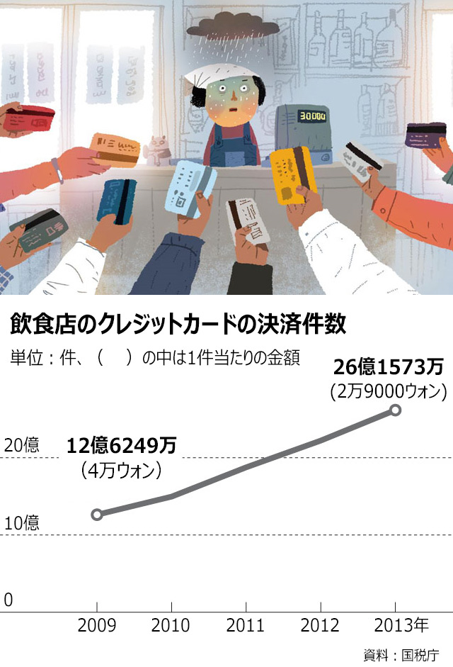 割り勘の拡散は、クレジットカードの決済金額の統計からも確認することができる。国税庁によると、飲食店でカード(クレジット、 小切手保証、デビットなど)決済した件数は、2009年の12億6250万件から13年には26億1600万件と4年で2倍以上に増加した。しかし、決済1件当たりの平均金額は同期間に4万ウォン(約3600円)から2万9000ウォン(約2600円)と、むしろ27.5%減少した。韓国外食業中央会の関係者は「職場の会食や同窓会の集まりのように一度に数十万ウォン(数万円)という大きな金額を決済するケースを除けば、ほとんどのお客さんが自分の食事代を別個に支払っている」と話す。