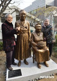ソウル市麻浦区の「戦争と女性人権博物館」で29日、女性人権運動家の金福童(キム・ボクトン)、吉元玉(キル・ウォンオク)像の除幕式が行われ、金さんと吉さんが記念撮影に応じた。今回の像は、「平和の少女像」を手掛けたキム・ソギョン、キム・ウンソン夫妻が、二人の人生に深い敬意を抱いて制作し、献呈したもの。