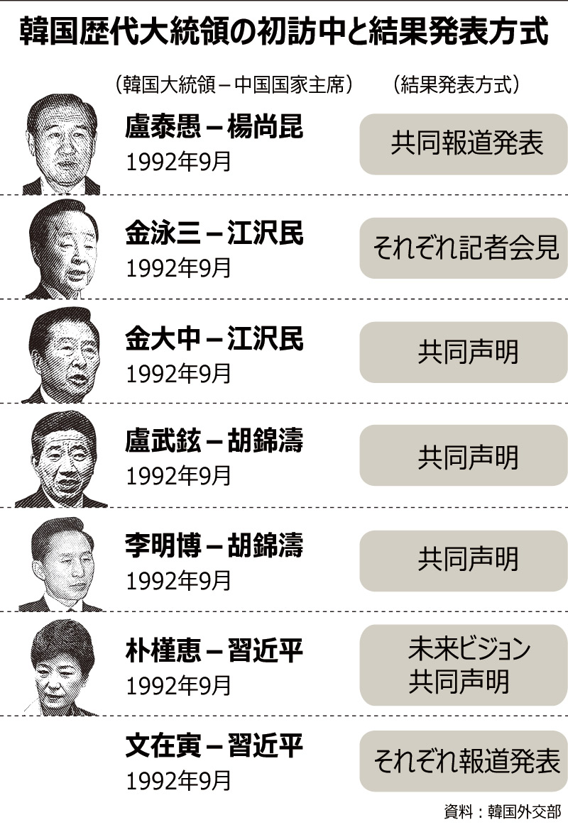 1992年の韓中国交正常化以降、韓国の大統領が中国を国賓として公式訪問した例は7回ある。うち第1次北朝鮮核危機のさなかの1994年3月に行われた金泳三(キム・ヨンサム)元大統領の訪問時のみ会談結果の文書がなかったが、残る6回は共同声明や共同報道発表が出された。金大中(キム・デジュン)、盧武鉉(ノ・ムヒョン)、李明博(イ・ミョンバク)の各元大統領と朴槿恵(パク・クンヘ)前大統領はいずれも就任1年目に公式訪中し、「韓中共同声明」を発表した。盧武鉉、李明博の各元大統領と朴槿恵前大統領は中国国家主席との共同記者会見にも臨んだ。
