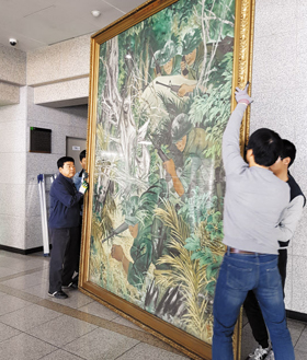 「敵影」というタイトルのこの絵は1972年の作品で、大きさは縦3メートル×横2メートル。ベトナムに派兵された韓国軍「猛虎部隊」が熾烈な戦闘を展開した、ベトナム638高地の戦いを題材にしている。密林深く匍匐する将兵らを描き、厳しい眼光の描写で有名だ。朴正煕(パク・チョンヒ)政権時代に閣僚らがこの絵を購入し、国防部に寄贈したという。79年12月12日のいわゆる「粛軍クーデター」の際、国防部を襲撃した部隊の銃弾で絵が破損したこともあった。当時、1発の銃弾が絵に描かれた韓国軍兵士の目を貫通したが、後に修復された。最近の鑑定価格は3億ウォン(約2970万円)だという。だが金画伯は植民地時代に軍国主義を称賛し、強制徴集を後押しする絵を描いたことで論争になり、国防部から撤去すべきだという主張がおよそ10年前から持ち上がっていた。