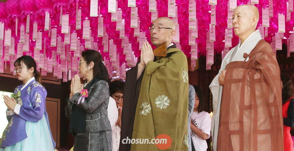 ▲釈迦誕生日だった22日午前、ソウル市広津区の寺「祇園精舎」の法要に、日本人僧侶の田中清元住職=写真右から2人目=が雪峰老師=同右端=と共に参加した。田中清元老師は16年にわたり釈迦誕生日に祇園精舎を訪れ、日本の強制連行で犠牲になった韓国人のための慰霊法要を開いている。写真=パク・サンフン記者