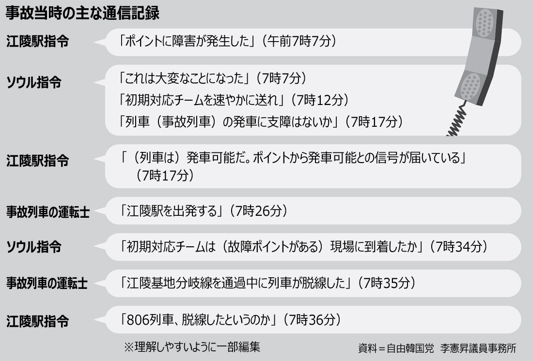 野党・自由韓国党の李憲昇(イ・ホンスン)国会議員は、ソウルと江陵駅の指令、事故列車の間で事故当時に交わされた通信内容を明らかにした。ポイント故障の発見から脱線事故発生までの時間は28分間だった。適正に対処していれば、事故を防ぐことができた。しかし、KORAIL管制センターはどのポイントが故障したのかを把握できず、事故列車も故障に気づくことはなかった。