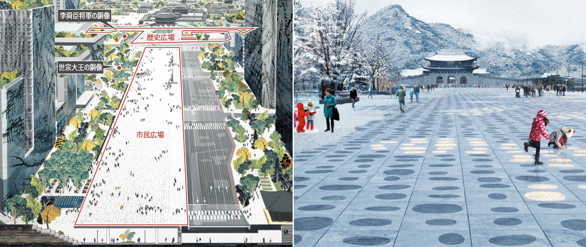ソウル市が21日に発表した光化門広場再整備事業設計図の当選作と鳥瞰(ちょうかん)図。1968年に広場に設置された李舜臣(イ・スンシン)将軍の銅像と、同じく2009年に建てられた世宗大王の銅像は広場の外に移転し(左図)、また広場の地面には歴史的な事件を象徴する造形物などが描かれるという(右図)。ソウル市は「キャンドル市民革命を形にした地面の装飾も行いたい」との考えを示した。