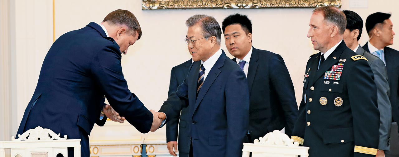 韓国の文在寅(ムン・ジェイン)大統領は21日、国防部(省に相当)の鄭景斗(チョン・ギョンドゥ)長官、ロバート・エイブラムス在韓米軍司令官など韓米両軍の上層部と共に大統領府(青瓦台)で昼食懇談会を開き、最近起こった北朝鮮のミサイル挑発に対し、両国軍が緊密に助け合ったと称賛した。この日の懇談会では、文大統領が北朝鮮のミサイルについて「ダンド」ミサイルと発言し、後になって大統領府が「短距離」ミサイルと訂正するハプニングも起きた。