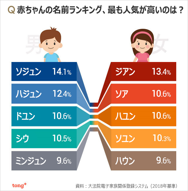 大法院(最高裁判所に相当)が作成した赤ちゃんの名前の現況に関する資料によると、2018年に出生届けが出された赤ちゃんのうち、男の子の名前はソジュン、女の子の名前はジアンの人気が最も高かった。