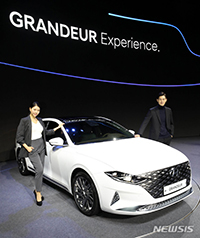 現代自動車の「ザ・ニュー・グレンジャー」の新車発表会が開かれた19日午前、京畿道高陽市のピンマル放送支援センタにて、新車の前でポーズを取ってPRするコンパニオンの様子。