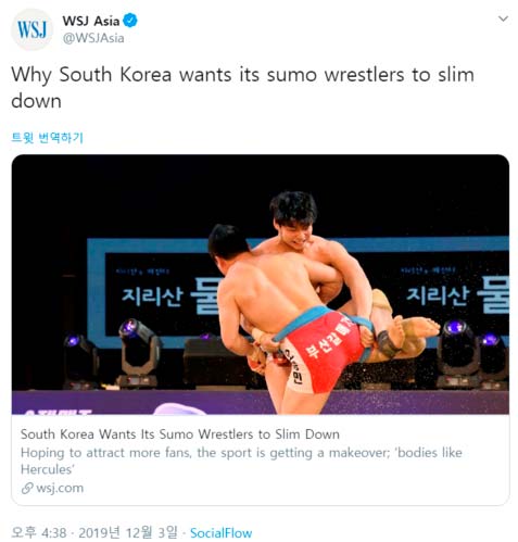 米紙ウォール・ストリート・ジャーナル(WSJ)が、韓国の伝統スポーツ、シルムの変化について紹介した際、シルムを「スモウ(Sumo)」と表記し、物議を醸している。