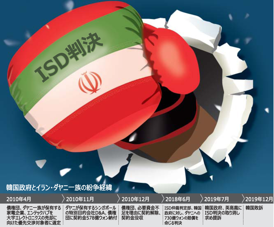 韓国政府が昨年6月にイランのダヤニ一族との投資家・国家間訴訟(ISD)で敗訴したことを受け、英国の高裁に判定の取り消しを求めていた訴訟で、韓国政府が再び敗訴した。金融委員会が22日、明らかにした・これにより、韓国政府は昨年の判決に従い、2010年の韓国資産管理公社(KAMCO)などの債権団が大宇エレクトロニクスを売却する過程でダヤニ一族から没収した契約金に利子を上乗せし、総額730億ウォン(約69億円)を支払わなければならない立場となった。ISDは投資先の国の政府による過失で被害を受けた企業が起こす国際訴訟だ。韓国政府を相手取ったISDで判決が確定したのは今回が初めてだ。