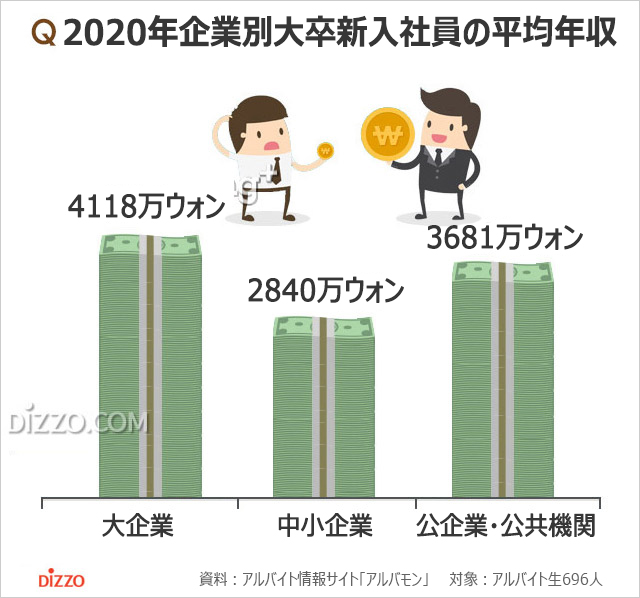今年の大企業と中小企業の新入社員の平均年収は1278万ウォン(約127万円)の差があった。また、公企業・公共機関の新入社員の年収は平均3681万ウォン(約370万円)で、大企業に比べ437万ウォン(約40万円)低いことが分かった。