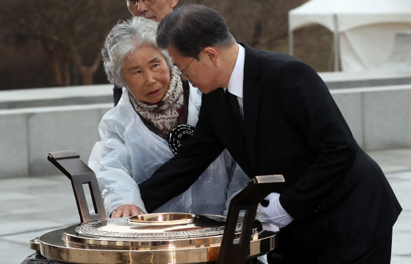一人の白髪のおばあさんが、27日に国立大田顕忠院で開かれた「西海守護の日」記念式典に出席した文在寅(ムン・ジェイン)大統領の前に立ちはだかった。「天安艦46勇士」故ミン・ピョンギ上士(曹長に相当)の母親だった。2010年3月26日、哨戒艦「天安」が攻撃を受けたため末の息子を失ったユン・チョンジャさん(76)だ。
