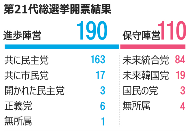 中央選挙管理委員会の集計によると、選挙区(253議席)で共に民主党は163議席、未来統合党は84議席を獲得した。無所属は5議席、正義党は1議席だった。特に首都圏の121議席は与党が103議席を占めた。47議席を争った比例代表では未来統合党系の未来韓国党が19議席、共に民主党系の共に市民党が17議席を得たほか、正義党(5議席)、国民の党(3議席)、開かれた民主党(3議席)だった。