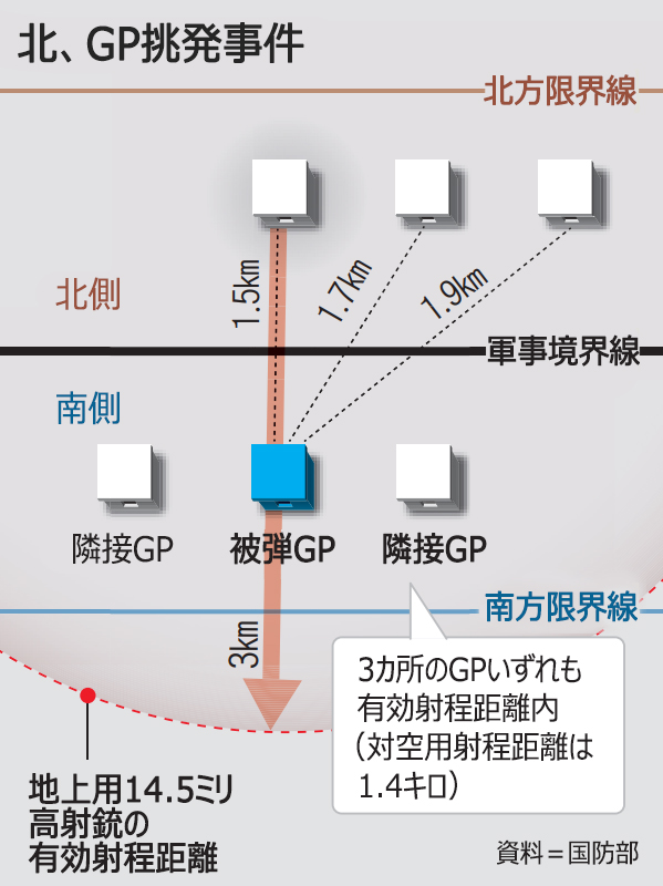 北朝鮮軍が今月3日に非武装地帯(DMZ)内にある韓国軍の最前方監視哨所(GP)へ銃撃を加えた際に使用した14.5ミリ機関銃(高射銃)の有効射程距離が3キロに達することが6日までに分かった。北朝鮮軍と韓国軍のGP間の距離が1.5-1.9キロである点を考慮すれば、有効射程距離内の韓国軍を狙って銃撃を加えていたことになる。合同参謀本部は今月3日に起こった北朝鮮による挑発について「意図性はない」と強調し「挑発であれば、有効射程距離の範囲内でやるのが常識」と主張していた。「挑発に使った武器の有効射程距離が1.5キロ以下のため、意図的な挑発とは考えにくい」という趣旨だった。これについては韓国軍の内外から「合同参謀本部は北朝鮮軍による挑発の意図性を縮小するため、有効射程距離の情報まで隠蔽(いんぺい)・歪曲(わいきょく)したのでは」との指摘も出ている。
