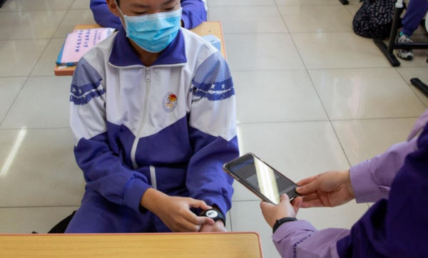 中国・北京の中高生たちの手首には腕時計型の「スマート体温計」がはめられている。