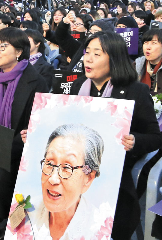 ▲昨年の「女性の日」に金福童さんの写真を掲げる尹美香(ユン・ミヒャン)氏 写真=オ・ジョンチャン記者(2019年3月8日撮影)