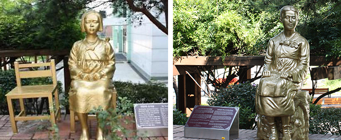 ▲ソウル・瑞草高校は2013年、校庭に慰安婦被害者をたたえる少女像=左の写真=を作った。しかし、彫刻家の金運成(キム・ウンソン)夫妻から「著作権法違反」という電話がかかってきたため、この少女像を廃棄した。そして同年9月、新しい少女像=右の写真=を作った。製作費用はそれぞれ600万ウォン(現在のレートで約54万円)だった。金運成氏は同じサイズの少女像の価格を3300万ウォン(約300万円)として受け取っている。金運成氏は2016年から正義連の理事を務めている。写真提供=瑞草高校