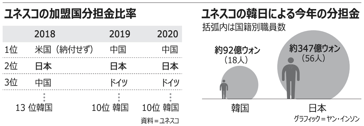 ユネスコは米国が完全に脱退した後、19年に加盟国の経済力に沿って分担金比率を改めて定めた。今年は加盟国193カ国が3154億ウォンの分担金を拠出する。その結果、中国(15.49%)が1位となり、日本(11.05%)は2位に追いやられたが、日本の発言力は依然として大きい。韓国は18年の13位から10位に浮上したが、分担金比率は2.93%で日本とは大差がある。