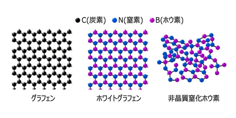 非晶質窒化ホウ素はホワイトグラフェンの派生素材であり、窒素とホウ素の原子で構成されているが、晶質化しておらず、分子構造を持っているためにホワイトグラフェンとは異なる。また、半導体を小型化するための重要条件の一つである誘電体として活用でき、電気的干渉を遮断する役割を果たす。すなわち、半導体集積化の加速で生じる電気的干渉という難題を突破できる素材と言える。