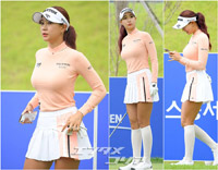 12日、釜山市機張郡のストーンゲート・カントリークラブ(6,491ヤード、パー72)で、「IS DONGSEO釜山オープン」(賞金総額10億ウォン=約9000万円、優勝賞金2億ウォン=約1800万円)第2ラウンドが行われた。写真は10番ホールでティーショットの準備をするユ・ヒョンジュ(26)=GOLDEN BLUE=。この日はサーモンピンクのトップスに、白のミニプリーツスカート×ハイソックスという優しい色づかいのコーディネートで登場した。