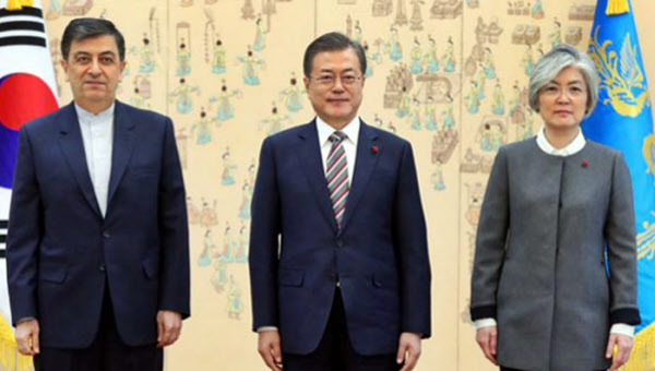 ▲文在寅(ムン・ジェイン)大統領=写真中央=と康京和(カン・ギョンファ)外交部長官=同右=、サイド・バダムチ・シャベスタリ駐韓イラン大使=同左=。写真=NEWSIS