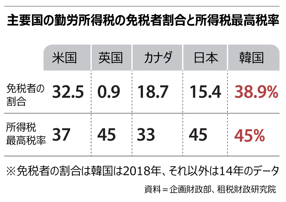 最高税率と最低税率の差が約3倍ある他の先進国とは異なり、韓国は7.5倍(最低税率6%)も開きがあり、税負担が少数に集中する現象がさらに深まりそうだ。現在でも韓国では税金を全く納めない免税者がほぼ40%に達し、高所得者の税負担が高いといういびつな構造となっている。勤労所得税を全く納めていない勤労者の割合は韓国が38.9%で、英国(0.9%)、日本(15.4%)、米国(32.5%)よりも高い。所得税全体で所得上位10%による負担割合は韓国が78.5%で最も高く、米国(70.6%)、英国(59.8%)、カナダ(53.8%)などを上回っている。韓国では所得上位20%が負担する所得税の割合が90%に達する。