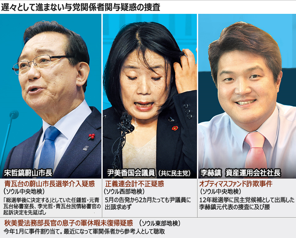 検察が手をこまぬいている与党関連の事件は「青瓦台の選挙介入」だけではない。正義記憶連帯(正義連)の会計不正疑惑を捜査しているソウル西部地検は今年5月に告発があってから2カ月たっても尹美香(ユン・ミヒャン)国会議員(共に民主党)に出頭を求めていない。ソウル中央地検はオプティマスファンド詐欺事件を巡り、民主党から総選挙に出馬した同社の李赫鎮(イ・ヒョクチン)元代表への捜査には及び腰だ。1兆6000億ウォン(約1420億円)の被害を与えたライム資産運用事件を捜査しているソウル南部地検も金品授受の疑いがある元市民運動家のK議員(民主党)に対する捜査が進んでいない。今年1月に秋美愛(チュ・ミエ)法務部長官の息子の軍休暇未復帰疑惑の捜査を割り当てられたソウル東部地検は最近になって、ようやく当時の軍関係者から参考人として事情を聴いた。