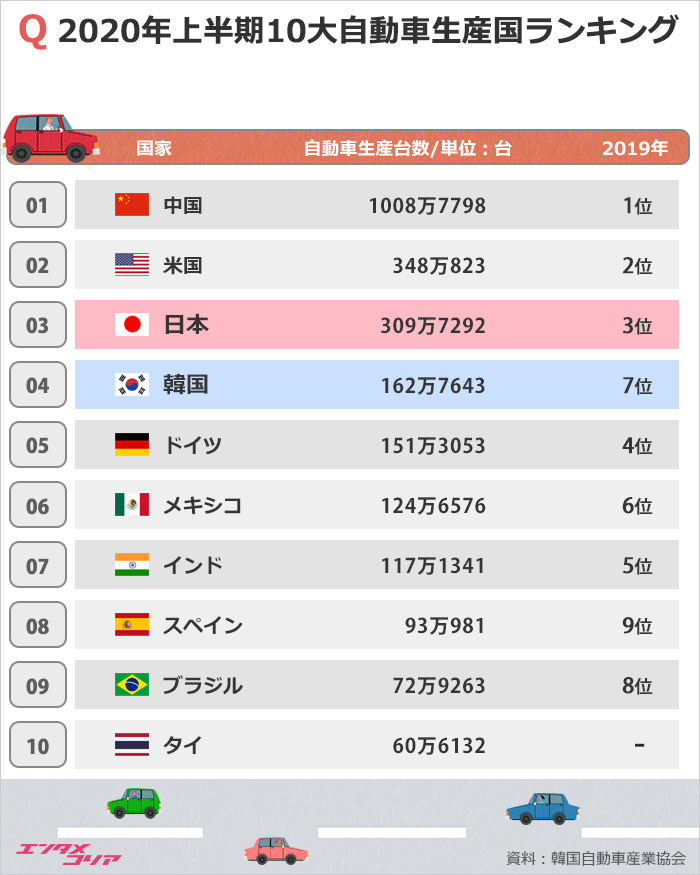 新型コロナウイルス感染症の拡大により、世界の自動車生産国ランキングに変動が生じ、2020年上半期に韓国が初めて4位にランクインした。