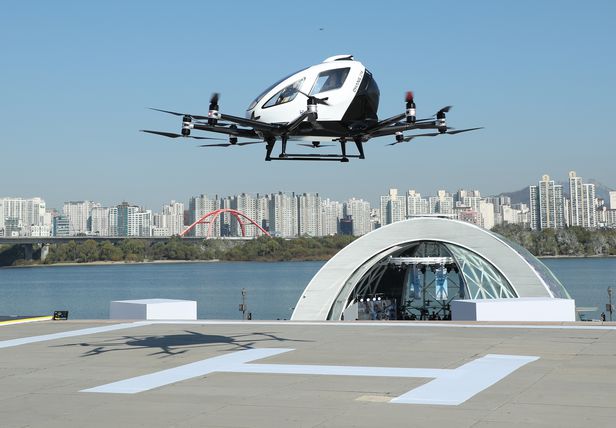 11日午前10時56分、ソウル汝矣島の漢江公園。プロペラ16個が付いた2人乗りドローンタクシーが50メートル上空に上昇した。ドローンタクシーとはドローン(小型無人機)がタクシーのように人を乗せ、都心を飛び交うものだ。この日は西江大学、パムソム、麻浦大橋一帯を7分間飛行した。安全問題を理由に実際の乗客ではなく、米俵を載せたが、韓国国内でドローンタクシーが飛行したのは今回が初めてだ。