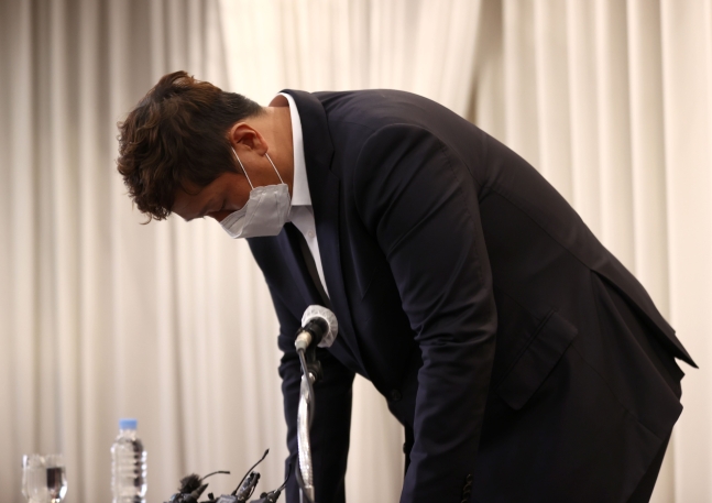 ▲弁公費引き上げ問題で批判を浴びる韓国プロ野球選手協会会長の李大浩(イ・デホ)=ロッテ・ジャイアンツ=。2日、ソウル市江南区のリベラホテルで、一連の騒動について釈明記者会見を開くのに先立ち、頭を下げた。写真=連合ニュース