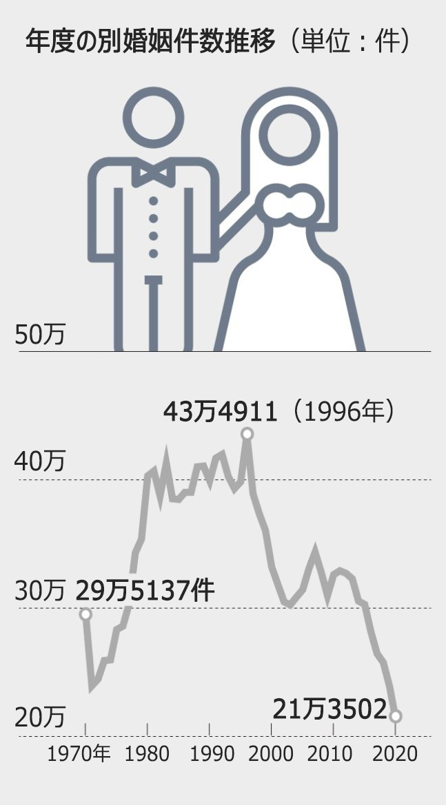 ただし、結婚して20年以上過ぎた後に離婚する「熟年離婚」は3.2%増加した。離婚した夫婦の平均婚姻期間は16.7年だった。これは10年前より3.7年長い。結婚直後に別れるケースよりも、長年夫婦として生活した後に離婚を決心するケースが増えているということだ。