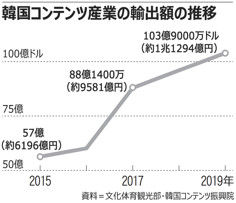 Kポップは、準備段階から海外のメンバーや作曲家を迎え入れて海外のファンを攻略するなど、その形式・内容いずれもグローバル化した。韓国ドラマも、世界最大のオンライン動画配信サービス「ネットフリックス」と手を組み、世界の視聴者を意識したコンテンツを制作し、テレビや映画館を経ずともすぐに世界の人々へ作品を届ける。逆に日本は内需市場に集中する傾向があり、また「クール・ジャパン」のような政府主導の文化プロジェクトが、海外攻略のための民間部門の力動性をそいでいるという分析がある。両国のドラマ輸出の実績において、韓国(2億4000万ドル=約261億円)は日本(3200万ドル=約35億円)の8倍に達するのが端的な例だ。